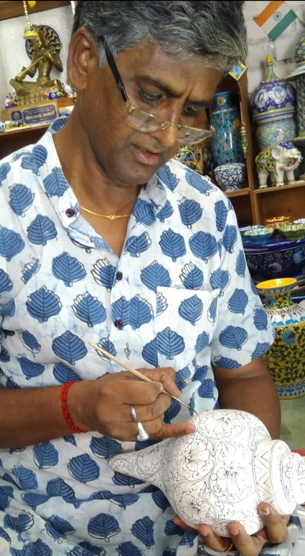 Gopal Saini is a multi talented personality he completed his post graduation in Drawing and Painting. Later he did his professional training in Music and learned to play Guitar (Visharad in Music.) According to Gopal Saini Jaipur Blue Pottery is a sadhana (practice) and dhyaan (meditation) to the artist – the only reason he practices the art form because it brings satisfaction to his soul.